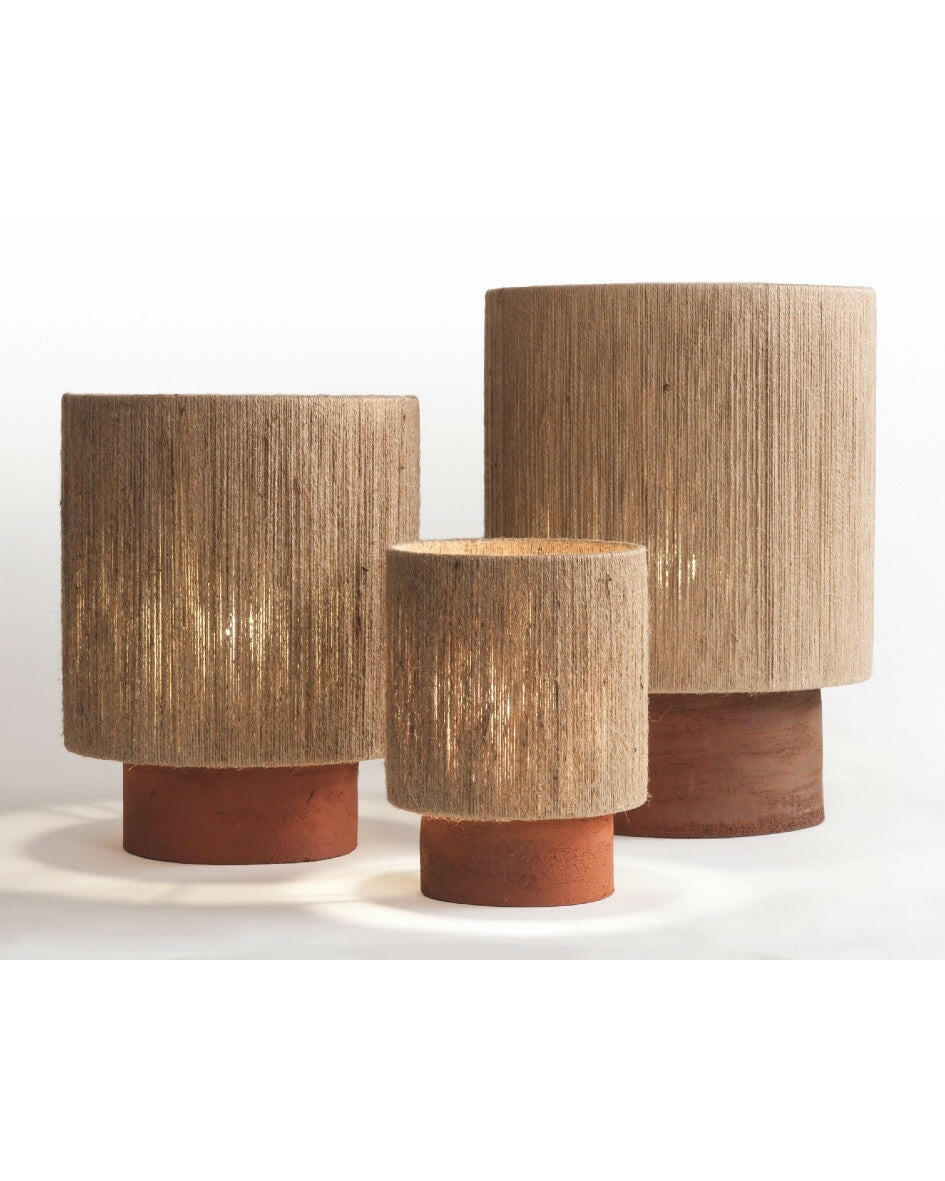 Le pied de cette lampe est en grès argile rouge et son abat-jour en fil de jute naturel tendu à la main.