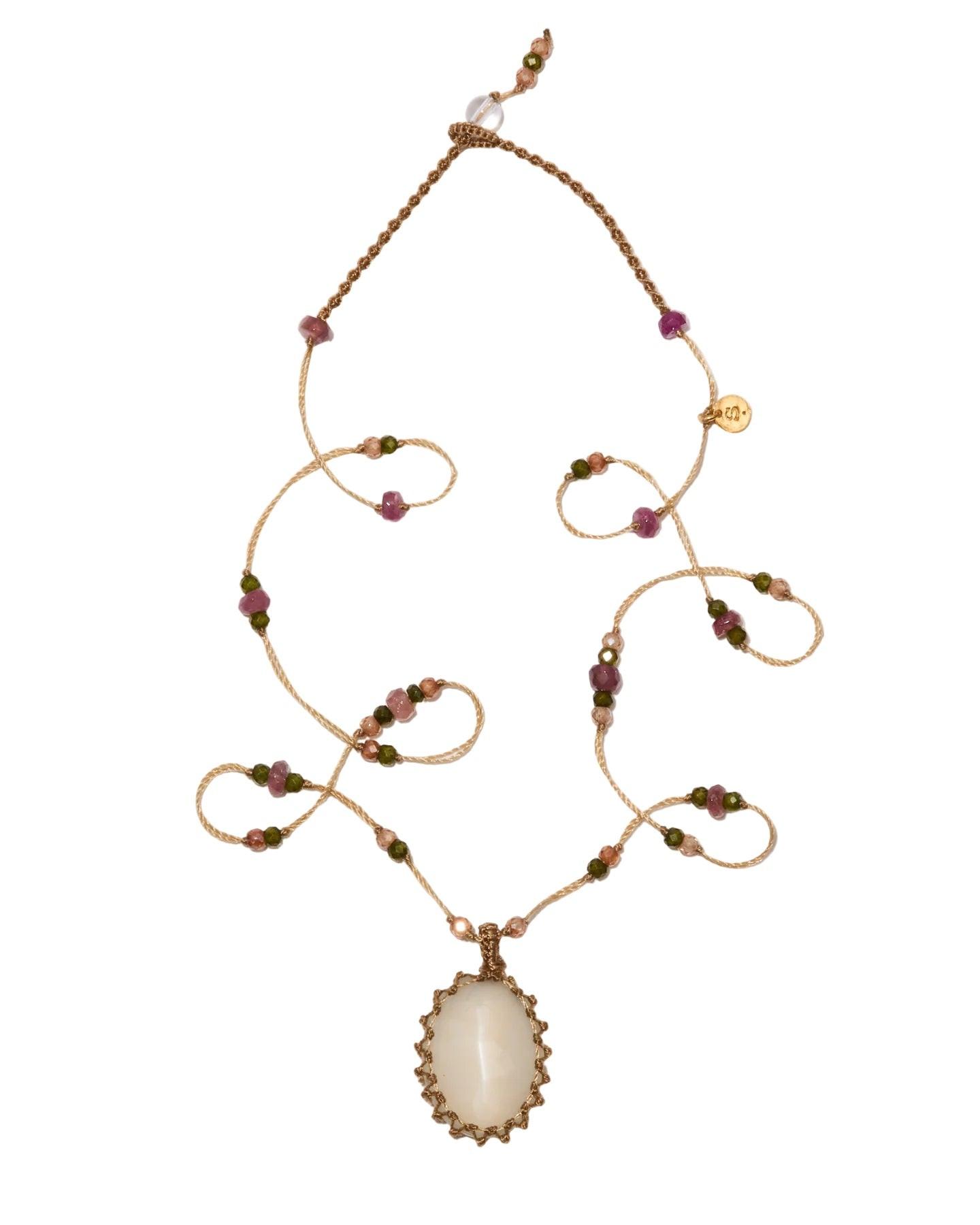 En pendentif, la Pierre de Lune, évocatrice de douceur et de mystère, est délicatement lovée dans un fil beige résistant. Elle est accompagnée d’un subtil mélange de perles de tourmaline rose et de zirconium, apportant lumière et équilibre à l’ensemble.