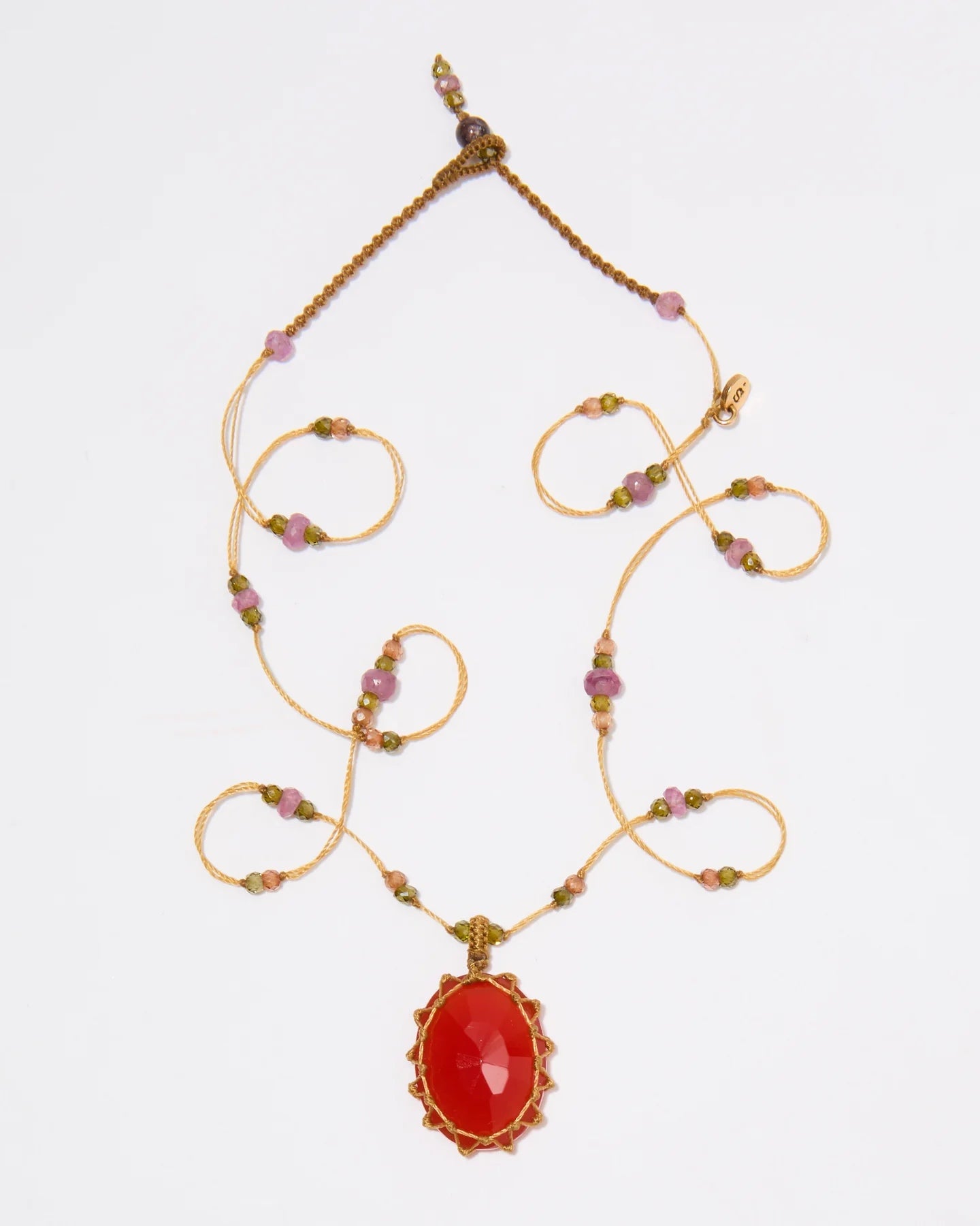 Le pendentif Onyx Orange facetté, monté sur un fil résistant et associé à des perles de tourmaline rose et de zirconium.