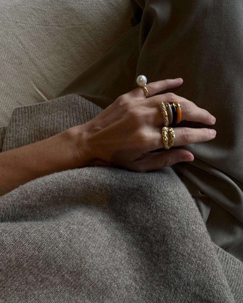 The Karlis ring, from the Victoire collection, reinterprets the classic pearl in a modern and bold way. Its irregular shape gives it a strong character, while the freshwater pearl adds softness and elegance.